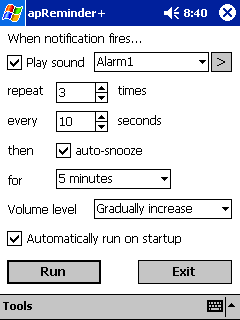 This small program enhances a standard PocketPC's Reminder feature. With apReminder+ you can have a reminder sound repeating every several seconds until you close the Reminder dialog, or it can be snoozed automatically after some time.